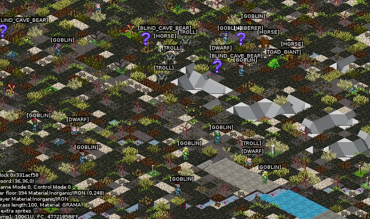 Stonesense has been updated, so here's a picture of the goblins chasing the cat in all its glory. The cat's in the upper left behind a tree. I managed to drop the entire group into the entrance pit. Kind of a lot of good equipment on them, but if i don't smash them there will be about 10 zombies down there I really dont want to deal with.